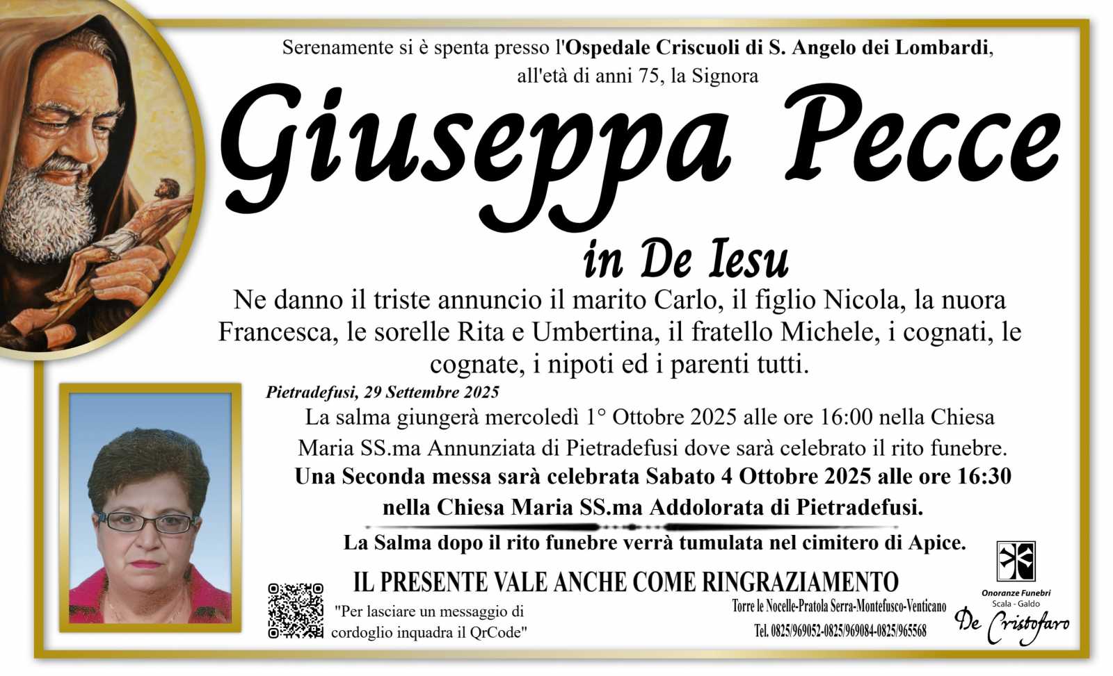 Lascia gratuitamente un messaggio di cordoglio, sarà nostra cura consegnarlo ai congiunti di Giuseppa Pecce.