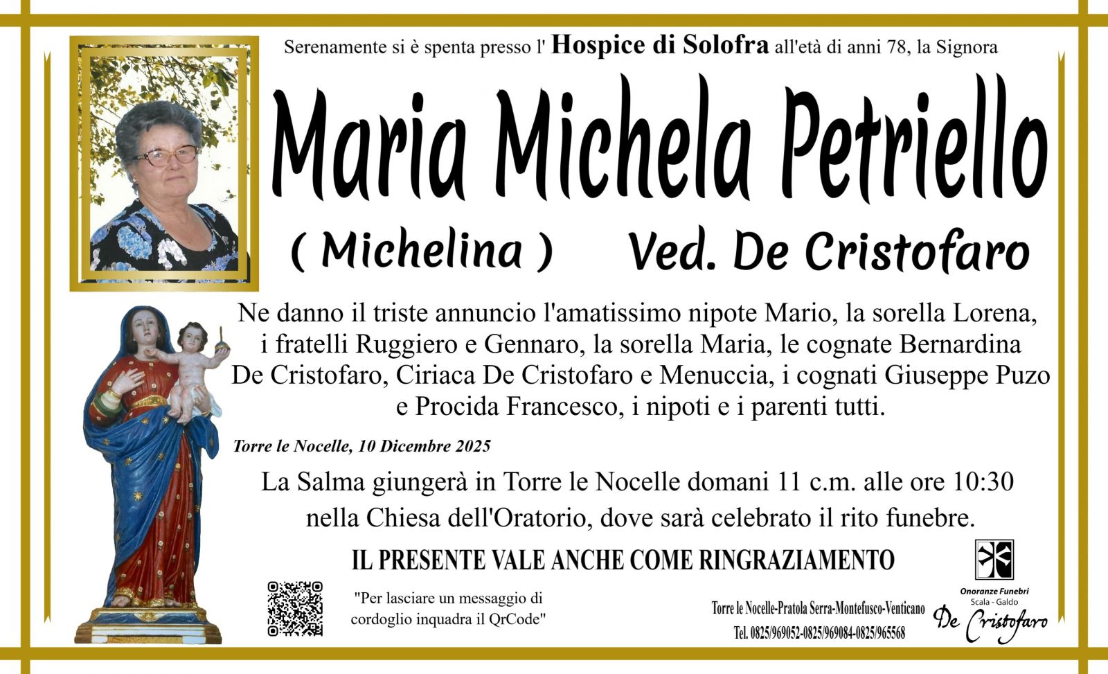 Lascia gratuitamente un messaggio di cordoglio, sarà nostra cura consegnarlo ai congiunti di Maria Michela Petriello.