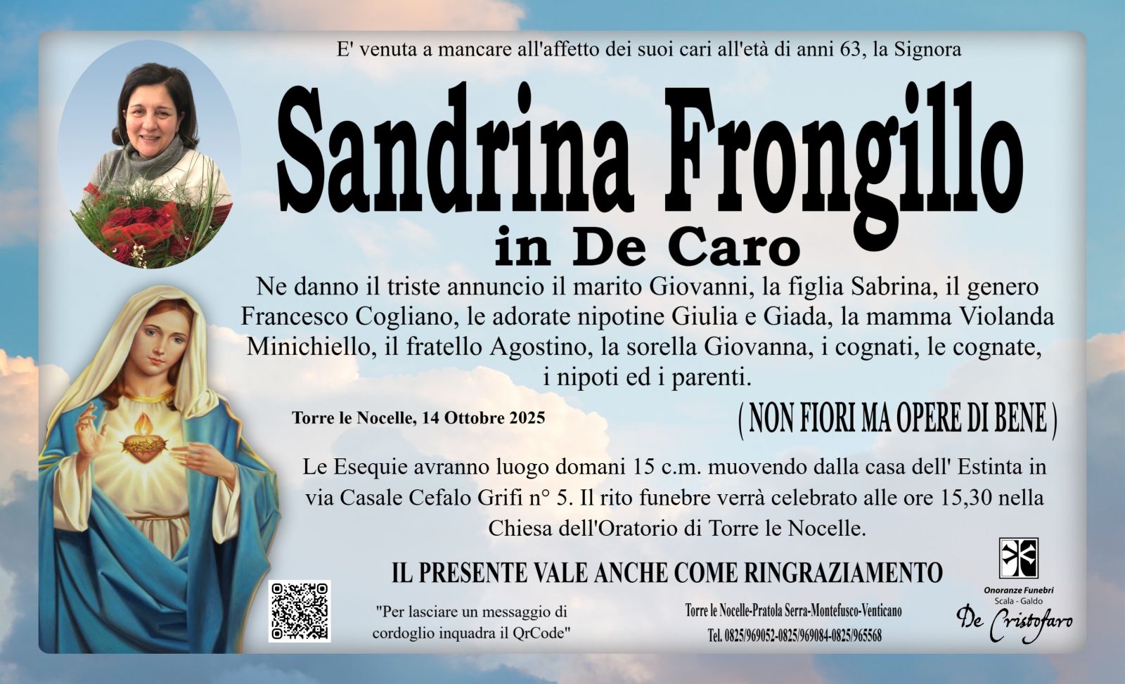 Lascia gratuitamente un messaggio di cordoglio, sarà nostra cura consegnarlo ai congiunti di Sandrina Frongillo.